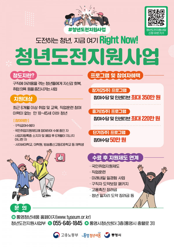 청년도전지원사업에 참여를 희망하는 청년은 통영시청년센터 청년도전지원사업팀(☎055-646-1845)으로 문의 또는 통영시청년센터 홈페이지(http://tyseum.or.kr) 및 고용24 홈페이지를 통해 온라인 접수가 가능하다. - 청년정책