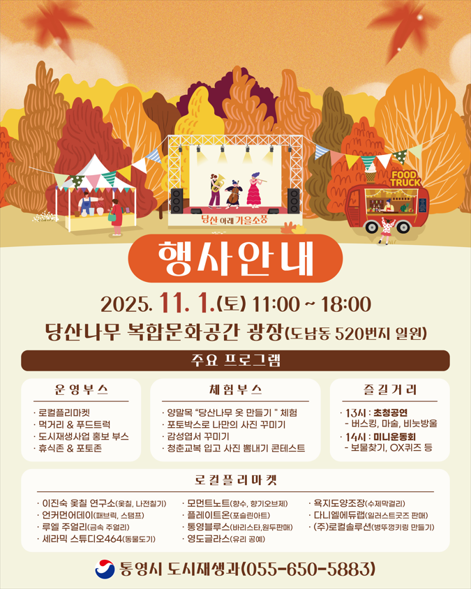 사업내용에 관한 표입니다. 사업내용 통영시 봉평지구 도시재생사업 일환으로 개최 예정인 마을 문화예술프로그램「당산 아래 가을소풍」진행 참고자료 기관위치/연락처
