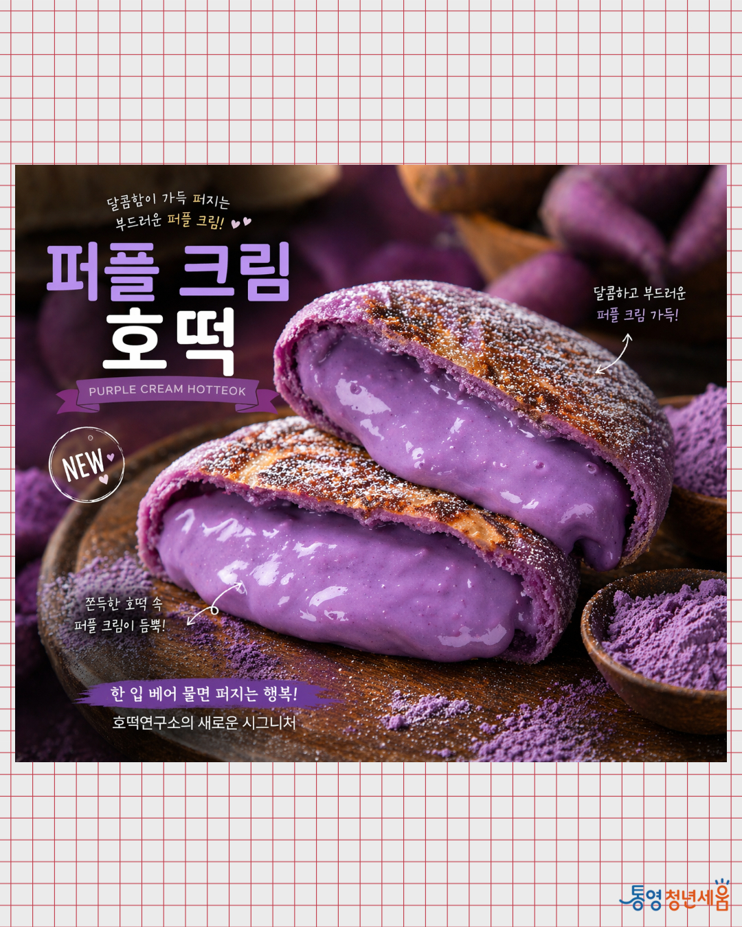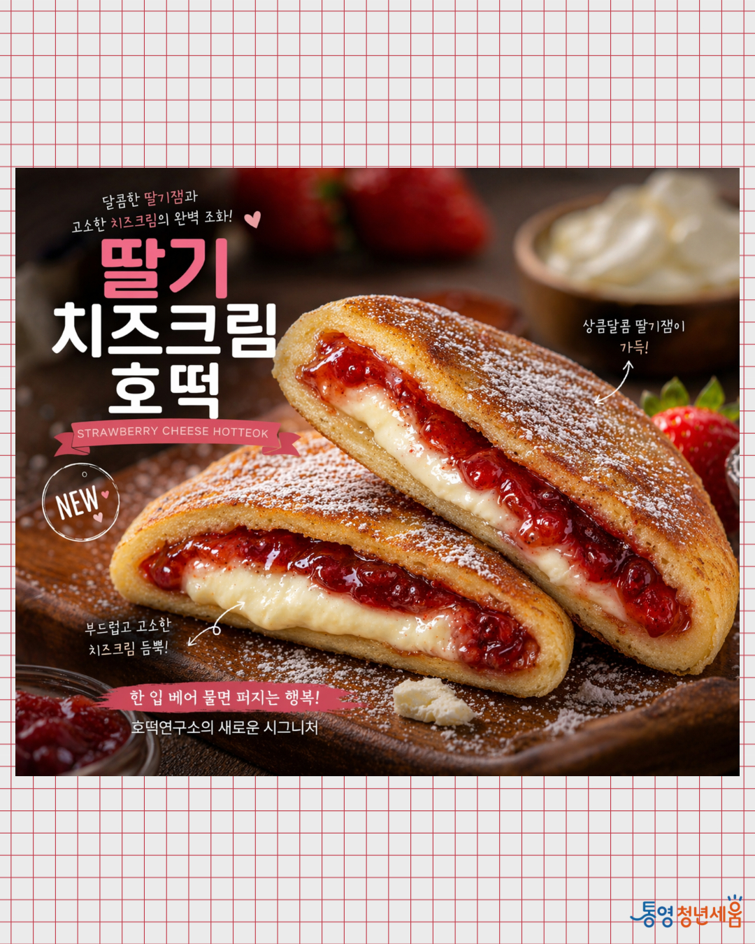 통영청년세움 센터소개 인사말 함께하는 사람들 오시는 길 청년정책 통영청년정책 전국청년정책 청년소식 신청·예약 프로그램 신청 프로그램 후기 공간안내 및 예약 대관현황 청년문화거리 청년문화거리 2026포차셀러신청 청년포차만나보기 청년문화거리일정 청년문화거리소식 FAQ 청년학교 자주 묻는 질문 1:1 문의 동아리활동 통영청년소식 공지사항 정보공개 보도자료 프로그램 갤러리 세움TV 청년동행가맹점 현재페이지 위치 Home 청년문화거리 1차메뉴 통영청년세움 청년정책 신청·예약 청년문화거리 청년학교 통영청년소식 청년포차만나보기 2차메뉴 청년문화거리 2026포차셀러신청 청년포차만나보기 청년문화거리일정 청년문화거리소식 FAQ 청년문화거리 2026포차셀러신청 청년포차만나보기 청년문화거리일정 청년문화거리소식 FAQ 청년포차만나보기 2026 호떡연구소로 전화걸기 2026 호떡연구소 목록으로 이동 업체정보 업체정보 안내입니다. 대표전화 홈페이지 - 대표메뉴 1. 딸기 치즈크림 호떡 2. 퍼플 크림 호떡 3. 퍼플 인절미 티라미수 안내사항 목록